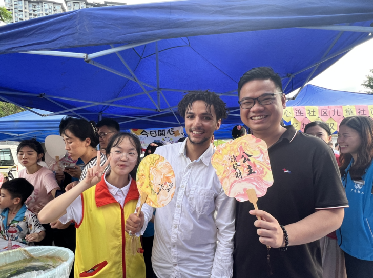 “这太有趣了,我从未见过这种制作方法!”MOMO小心地将白扇浸入漂浮彩漆的水面,轻轻一转,一幅独一无二的纹样便印在了扇面上。在杜鹃社区迎中秋活动现场,他第一次体验漆扇制作,眼中满是新奇。“志愿者手把手教我,怎么用竹签划出想要的纹理,如何控制扇面入水的角度。她说,这门手艺很自由,讲究的是‘顺势而为’,既要把握规律,也要接纳偶然。”MOMO回忆道,“那一刻很触动我。我原以为这只是一个漂亮的东西,没想到背后还包含这样的中国哲学智慧。”